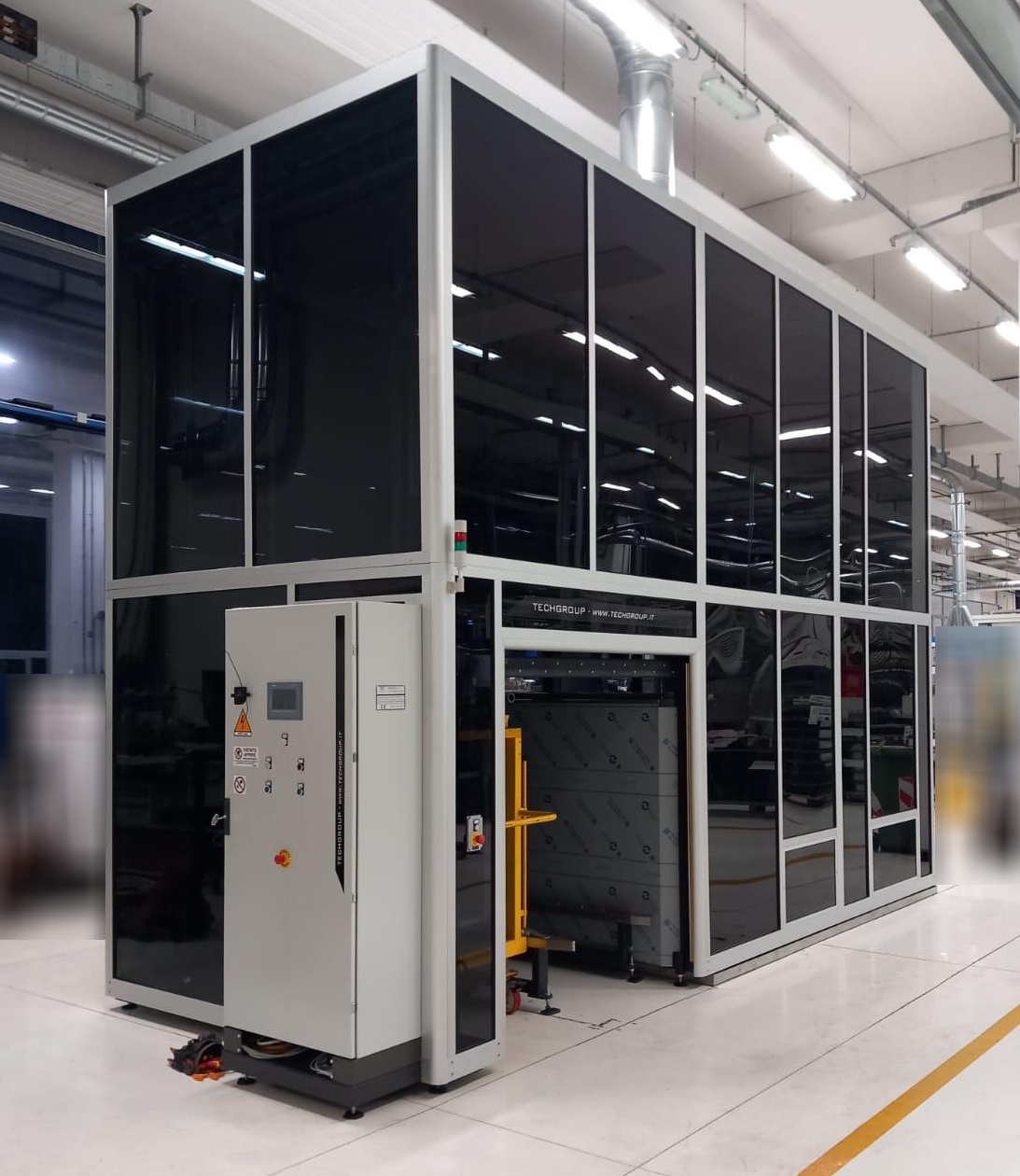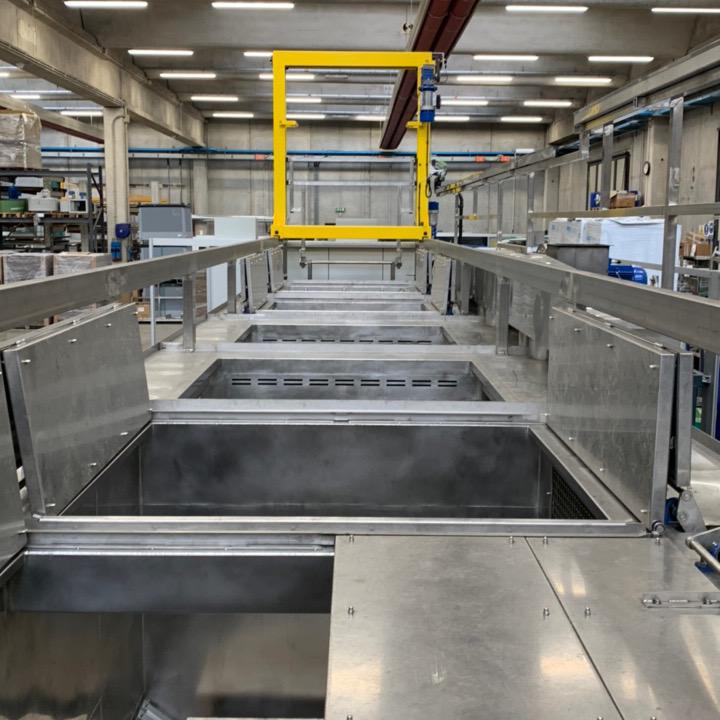 Tutte le vasche ed i forni sono realizzati in acciaio inox AISI 304, a doppia parete. Le vasche ultrasoniche sono complete di valvola di scarico a sfera, predisposizione per ultrasuoni, riscaldatori elettrici,termostato digitale, collare di aspirazione e coibentazione. Le vasche di risciacquo sono complete di rampe di immissione, tramoggia troppo pieno e valvola di scarico. Le vasche idrocinetiche sono complete di valvola di scarico a sfera, coperchio mobile manuale, collegamento a vasca tampone, vasca tampone esterna, pompa idrocinetica. I forni sono a doppia posizione, completi di riscaldamento termostato a doppia soglia, coperchio mobile automatico coibentato, coibentazione, sistema di riciclo dell’aria del tipo a “push-pull”, ventilatore di ricircolo e piedini di appoggio regolabili.